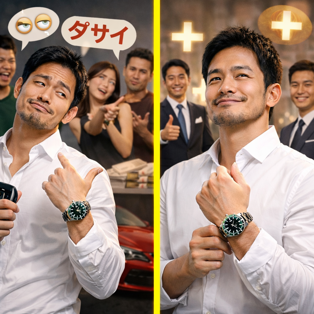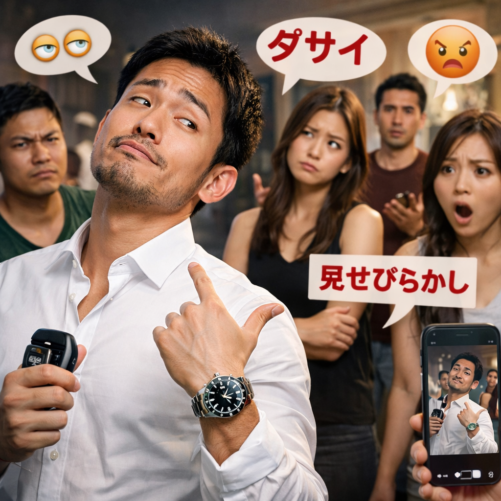 また、服装や場の雰囲気に対して時計だけが過度に目立つ着け方をしている場合、その違和感が強調され、「見せびらかしている」という評価につながりやすくなります。